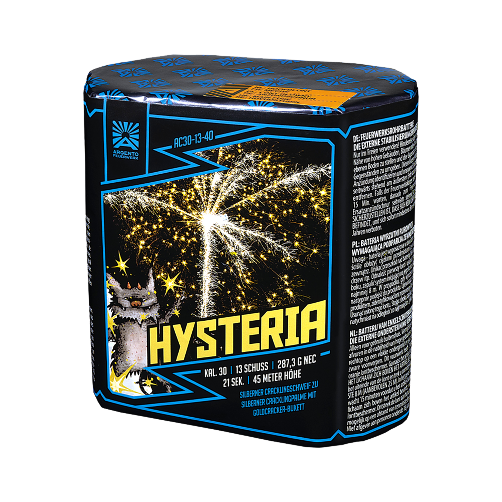 Hysteria van Argento. Silver cracker tail klim naar lang brandende zilveren cracker palm gecombineerd met een groot boeket van gouden crackers.
