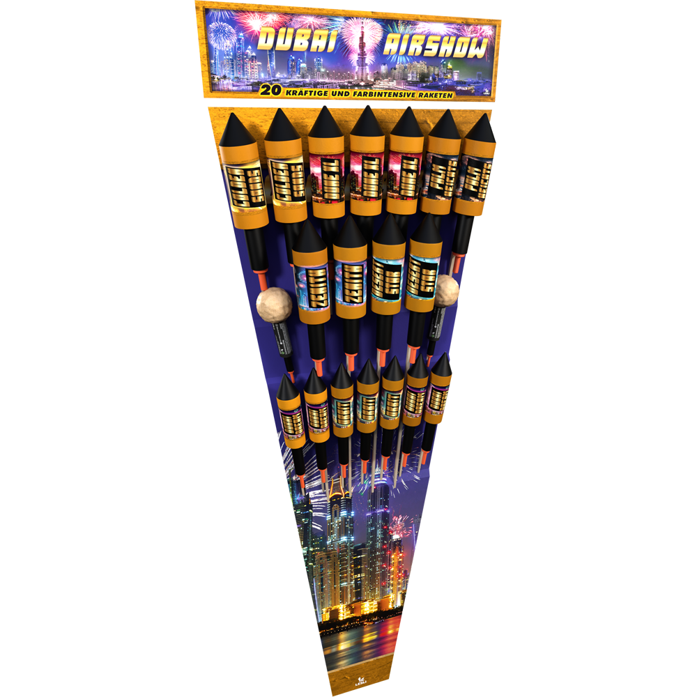 Arabische fascinatie in de lucht! 20 spectaculaire raketten met kleurexplosies van rode, groene en blauwe pioenrozen, glimmende glitterpalmen en gouden brokaat.