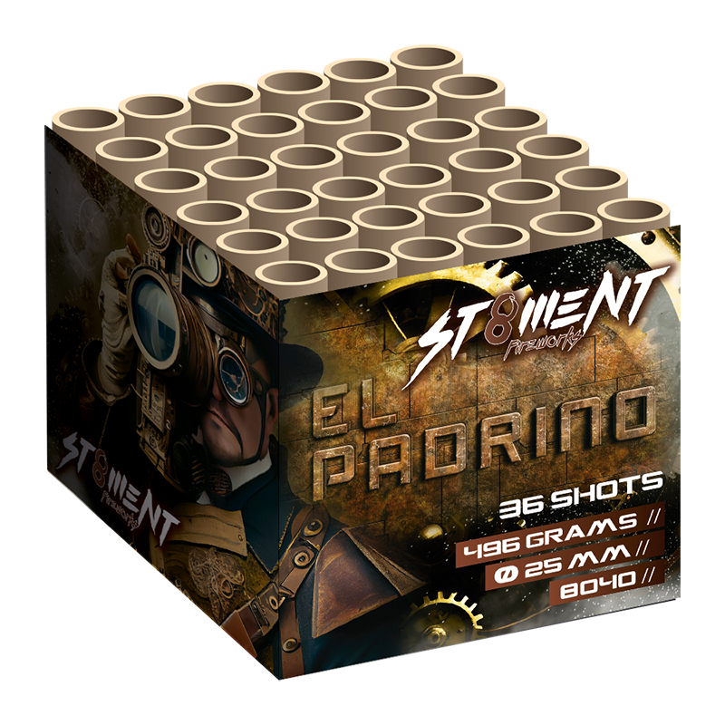 El Padrino is een baas van een losse cake. Deze cake bevat 36 schoten puur siervuurwerk. Met zeer bazige moving stars-effecten in goud, gecombineerd met roze, oranje en blauwe parels. Must have!