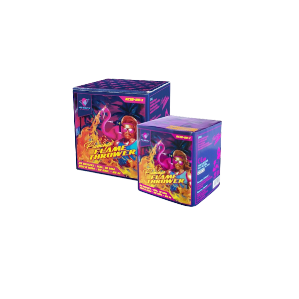 Flamingo Flamethrower van Albert Feuerwerk is een 18mm-batterij met 25 schoten en een staart die oprijst naar goud met neonkleurige transformatiepunten, gecombineerd met gouden flitsen.