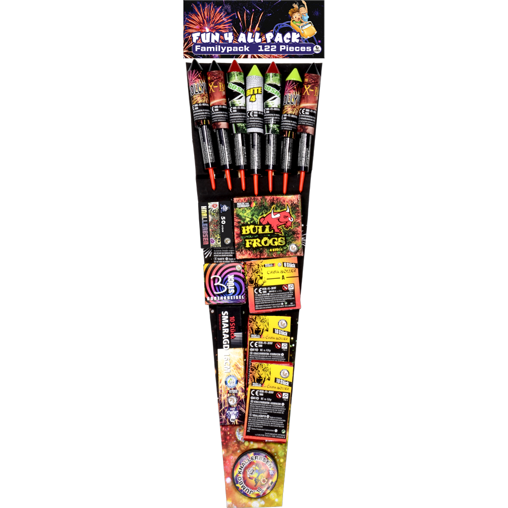 122-delig familieassortiment, inclusief 7 vuurpijlen.