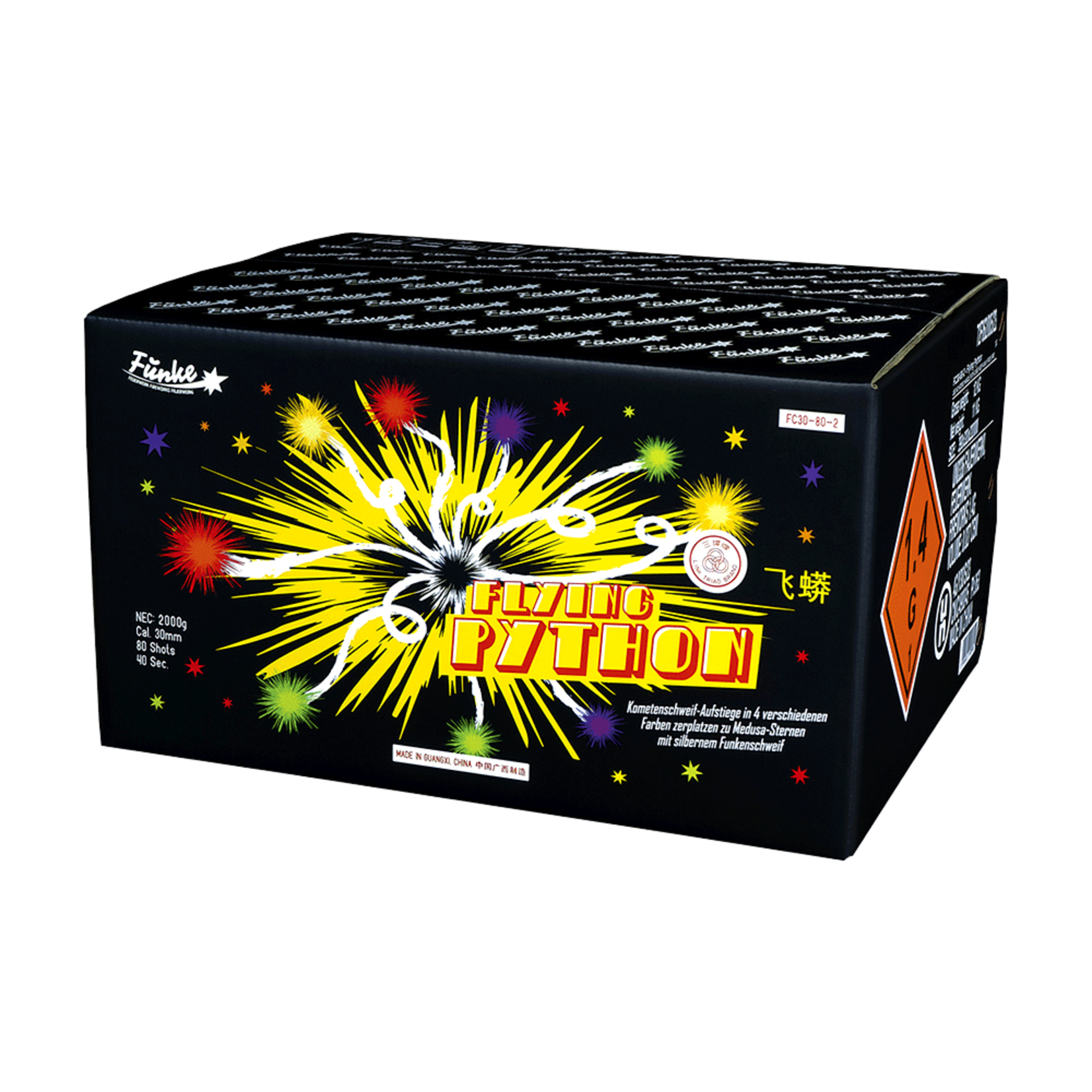 80 kogels in 30mm kaliber. Comet tail risers in 4 verschillende kleuren barsten uit in Medusa sterren met zilver fonkelende staarten.