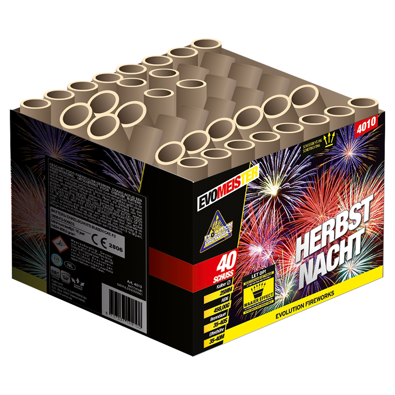 Herbstnacht, Maak u klaar voor een spectaculaire lichtshow! 40 schoten lang knalt deze absolute topper van een siercake de mooiste rode/gouden effecten de hemel in, om af te sluiten met een prachtige crackling burst!