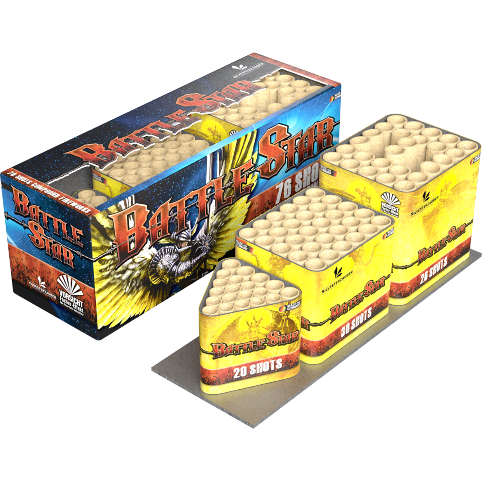 3 batterijen met elkaar verbonden geven bijna anderhalve minuut show. Eén keer schieten, 76 schoten.