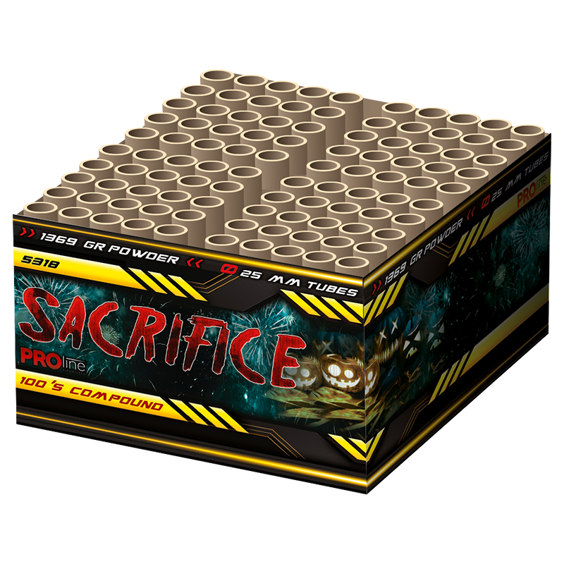 Het afsteken van deze Sacrifice compound van Pro-line Fireworks is een van de beste offers voor de oudejaarsnacht. Deze 100 schots rambak bevat diverse felgekleurde parel-effecten, kopergouden palmen met oranje parel en witte ghost-effecten, dat alles in prachtig opbouwend salvo-tempo. Dit is echt een musthave uit de Pro-line compoundselectie.