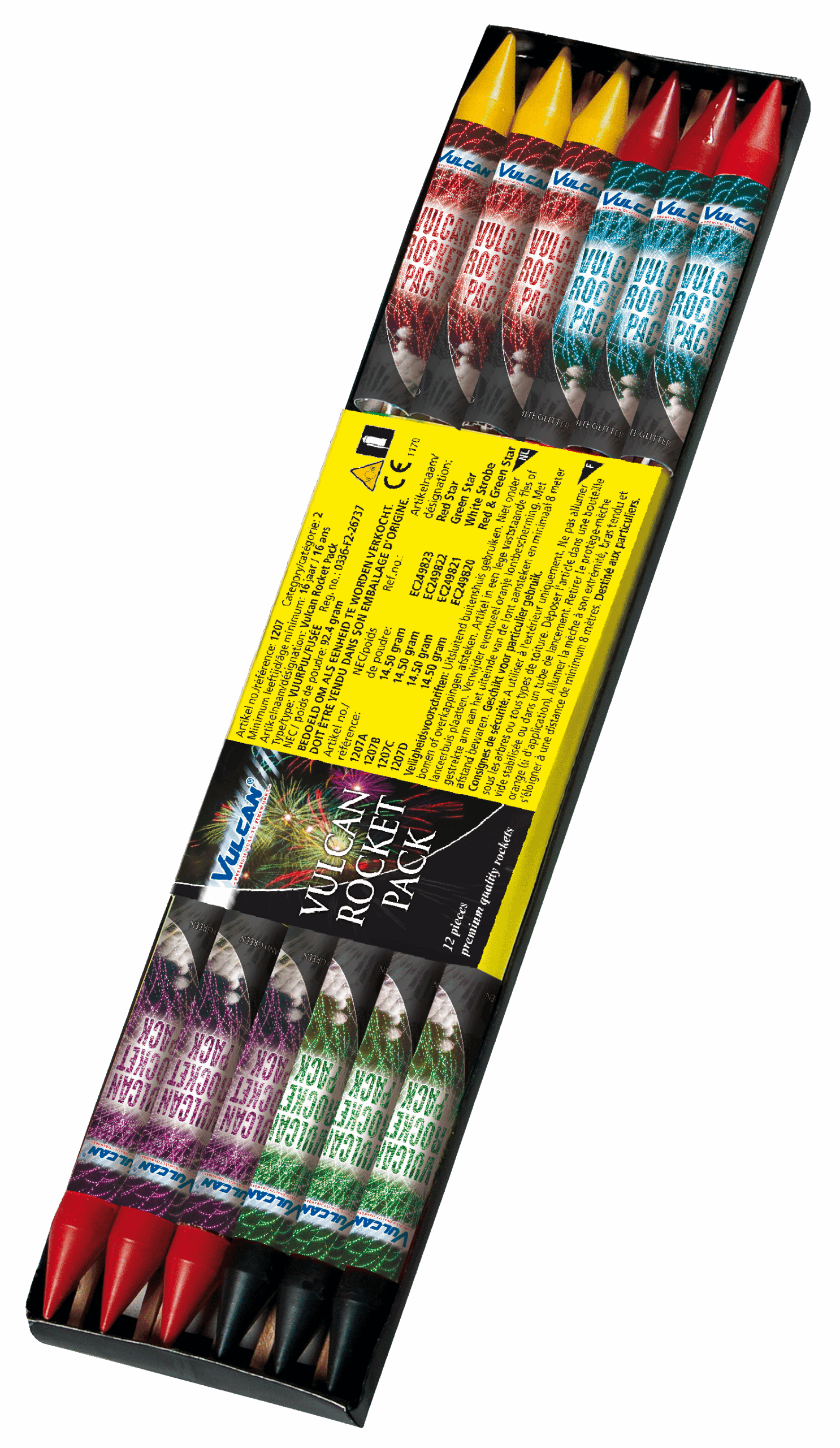 12-delig vuurpijlenpakket met diverse vuurwerkeffecten.